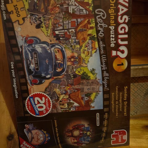 Trefl pussel med 1000 bitar. Motiv med två barn vid en leksaksbil i svartvitt med färgdetaljer. Lämpligt som sysselsättning för vuxna och äldre barn som tycker om pussel med många bitar.