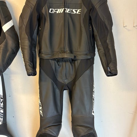 Invändigt finns meshfoder. Byxorna är i matchande svart skinn med förstärkta partier vid knän och säte. Stället är avsett för motorcykelkörning och ger skyddande klädsel för över- och underkropp.