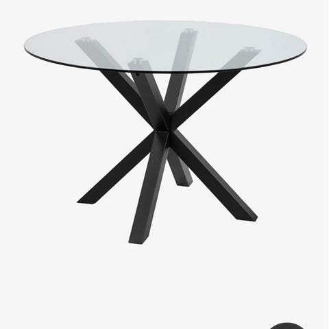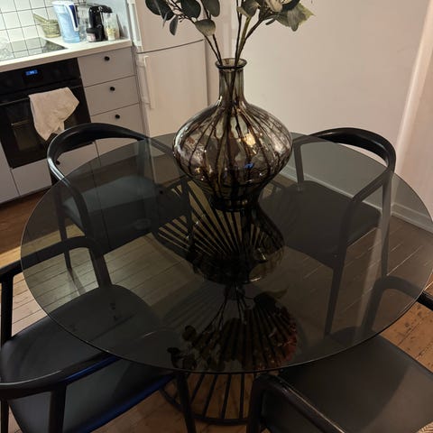 Runt matbord med en glasskiva och metallben