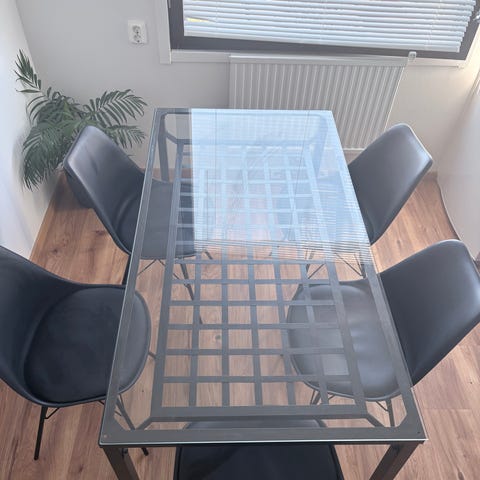 Matbordet har ett robust metallben och en tjock stabil glasskiva över, vi har använt underlägg för att inte skrapa ytan.