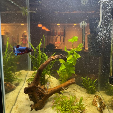 Juwel (suitable for marine) 200 liter akvarium med fiskar och växter säljes. Tillhörande skåp i mörkbrun/svart med förvaring. Inredningen består av grus, mangroveträ och levande växter. Akvariet är utrustat med en yttre filter och växtbelysning. Allt tillbehör medföljer.
