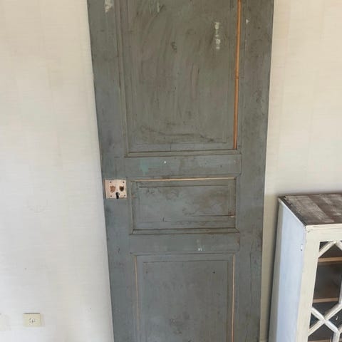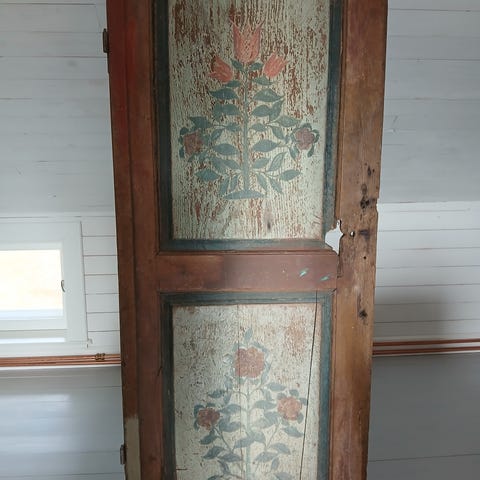 Vacker blå trädörr, troligen1700-tal, med speglar och smidda beslag och gångjärn i gjutjärn.