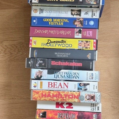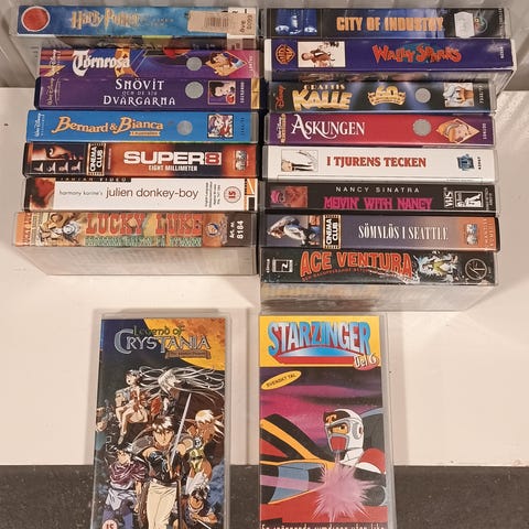 Samling med blandade filmer på VHS-kassetter. Flera olika titlar och genrer, både enstaka filmer och filmserier. Kassetterna är av standardstorlek för VHS och är avsedda för uppspelning i VHS-bandspelare. Passar för den som vill utöka sin filmsamling på VHS-format.