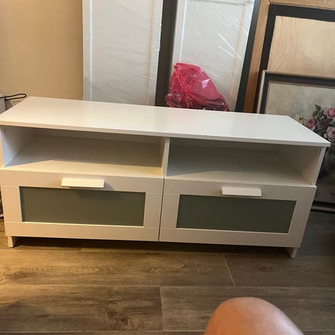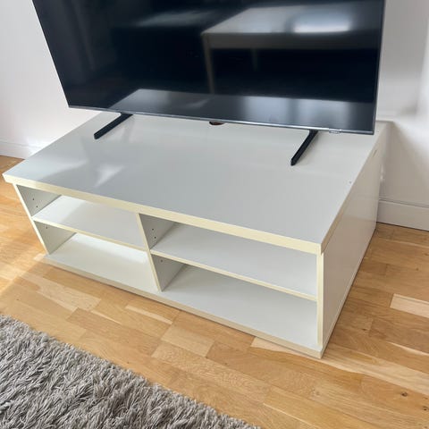 Säljer en snygg TV-bänk med frostat glas och stabil stomme i ljus färg. Perfekt för TV, spelkonsoler eller annan elektronik. Den öppna designen gör det enkelt att förvara och komma åt utrustning.
