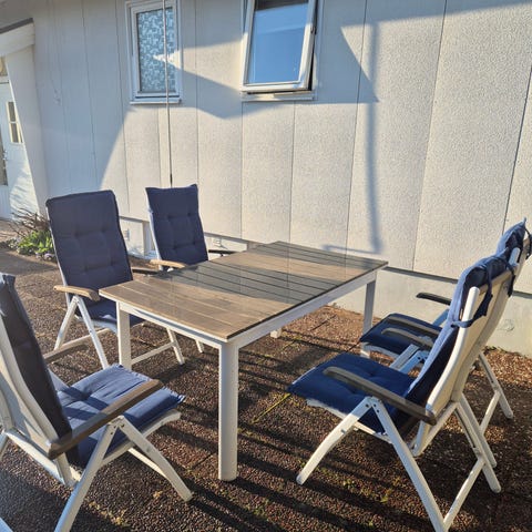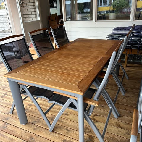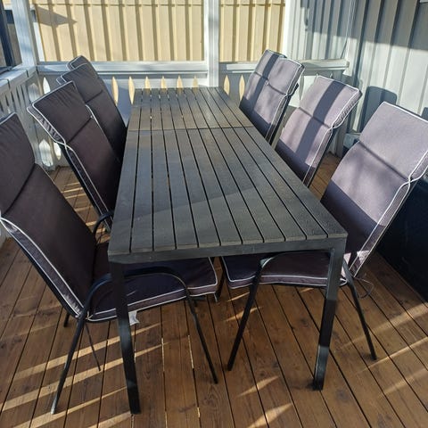Trädgårdsgrupp bestående av ett utdragbart bord och sex positionsstolar. Bordsskivan är i trä med ribbad yta och har en iläggsskiva som kan fällas upp för att förlänga bordet. Bordsben och stomme är i metall i grå färg.