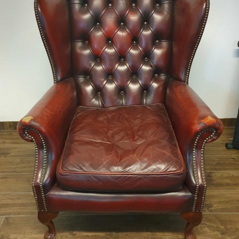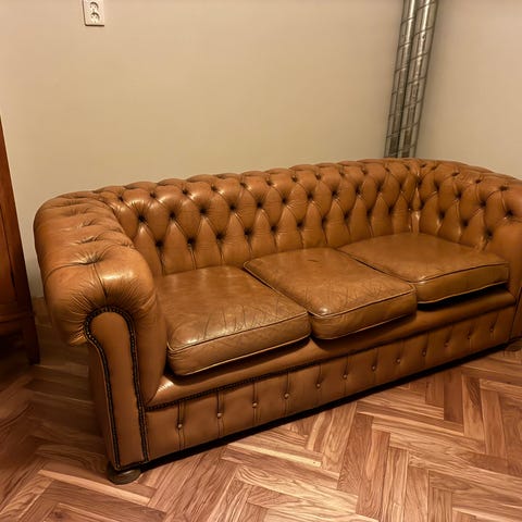 Grön Chesterfield-soffa i klassisk design. Bekväm och stabil med djuphäftad sits och rygg. Begagnad med viss patina och slitage som ger den en charmig vintagekänsla.