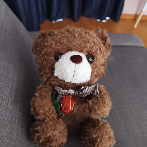 Liten nalle med snöre, ny, aldrig använt, kommer från djur och rökfritt hem, finns i Nacka, kan skickas mot fraktkostnaden.