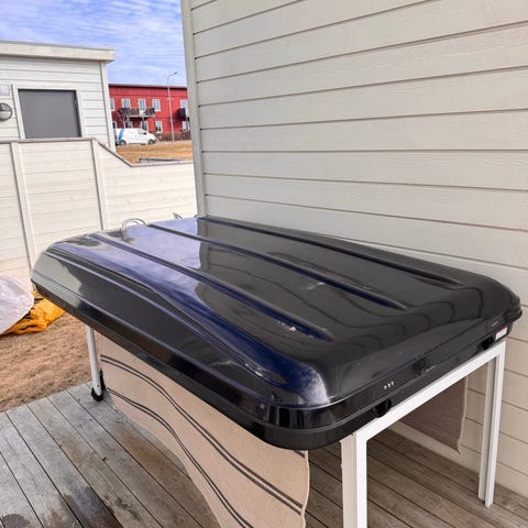 Boxen är monterad på takräcken Volvo original till V70 II.