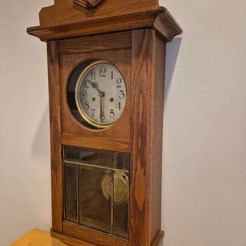 Otroligt snygg väggklocka som är i fint skick. Den kom igång och gick sen stannade den. När vi läst om gamla klockor så kan det va så när den inte använts på länge men vi vet inte helt och lämnar ingen garanti.