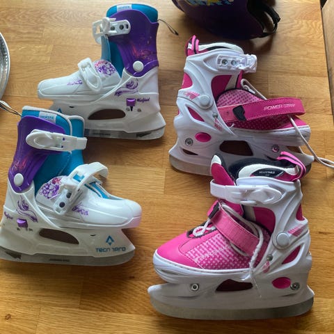 Rosa skridskor, Rosa inlines, Blå inlines. Justerbara med spännen och remmar. Storlek kan justeras från stl 33 till storlek 36.