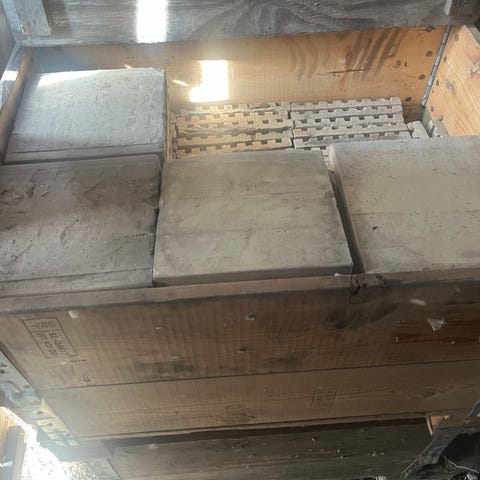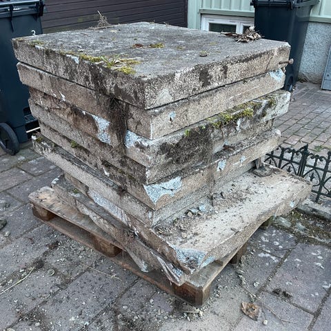 Rektangulära betongfundament i grå betong. Fundamenten är försedda med ingjutna bultar/infästningar på ovansidan och ligger på träpallar. Lämpliga som tyngder eller fundament vid exempelvis bygg- och anläggningsarbeten, avspärrningar eller montering av stolpar och liknande konstruktioner.