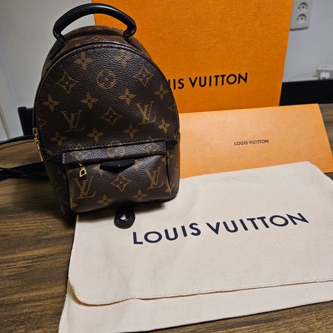 Utvändigt: Ingen märkbar slitage på canvasen. Lätta spår av användning på hörn och handtag. Små veck i läderdetaljerna. Något ur form på grund av förvaring.