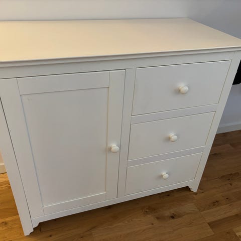 Byrå som kan användas både som skötbyrå och vanlig byrå. Skötdelen är löstagbar.