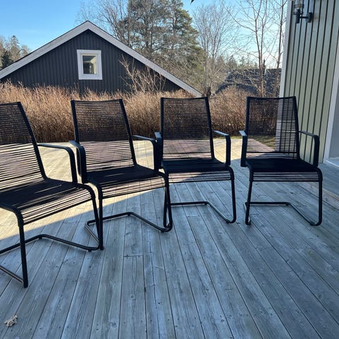 Trädgårdsstolar i svart färg med sits och rygg i nätmaterial. Stolarna har metallram med armstöd och är stapelbara. Passar för användning på balkong, altan eller uteplats tillsammans med ett utomhusbord.