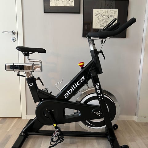 Mycket stabil spinningcykel. Pedaler med både korg och SPD. Integrerade transporthjul för förflyttning. Bra möjlighet att justera sadel och styre både horisontellt och på höjden.