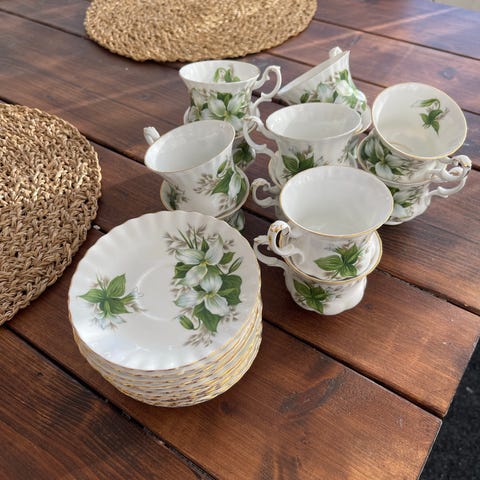 kaffekoppar med fat i porslin. Setet består av koppar och matchande fat med vit bas och dekor i guld samt små blommotiv invändigt. Porslinet har klassisk form med öra på kopparna och rundade fat. Passar för servering av kaffe eller te vid vardag och dukning vid särskilda tillfällen.
