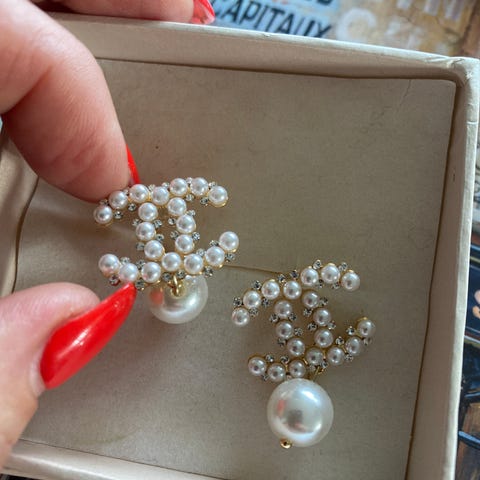 Örhängen med pärldetaljer i vit färg. Modellen har runda överdelar och hängande dekorationer formade av små pärlor. Passar som accessoar till vardag och fest. Materialet framgår inte närmare men ytan har pärlfinish i ljus ton.