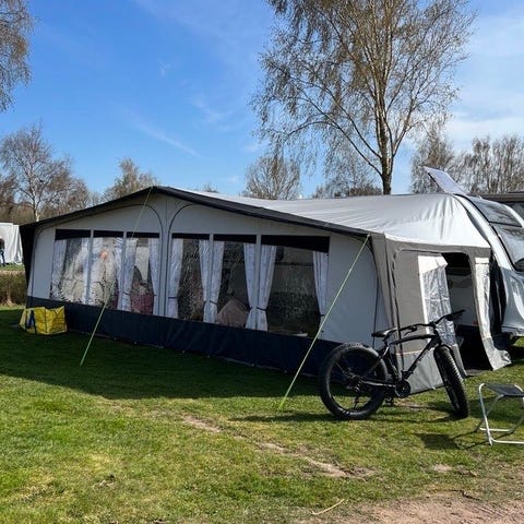 Eurotents Classic 2500 från 2020, med 2,5 m djup och alla möjliga tänkbara öppningsfunktioner. Front och sidor går att fälla ned eller ta bort helt. Dörrar är möjliga på sex ställen. På ena gaveln är fönstret öppningsbart och försett med myggnät. Gräskanten valfritt in- eller utåtvänd. Stativet är i stål.