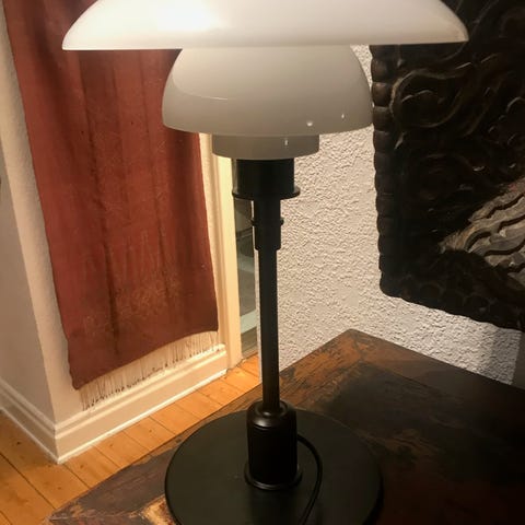 Bordslampa med smidesfot i mörk metall och vit glasskärm. Lampan har rund fot med tvinnade smidesdetaljer och en kupad skärm i vitt glas som ger ett mjukt, riktat ljus nedåt och åt sidorna. Utrustad med sladd och strömbrytare. Passar som belysning på bord, byrå eller sidobord i vardagsrum, hall eller sovrum.