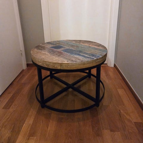 Finns tillhörande skänk/byrå (B92 D35 H88cm) och runt soffbord (dia. 70cm, höjd 46cm).