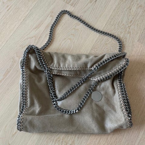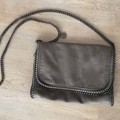 Stella McCartney axelremsväska i mocka för kvinna. Väskan har kedjehandtag och längre kedjerem för axel eller crossbody-bärande. Utsidan är i mocka med dekorativa kedjedetaljer längs kanterna. Insidan har ett huvudfack med mindre innerficka och stängs med magnetknäppning. Passar för vardagsbruk och till förvaring av mindre personliga tillhörigheter.