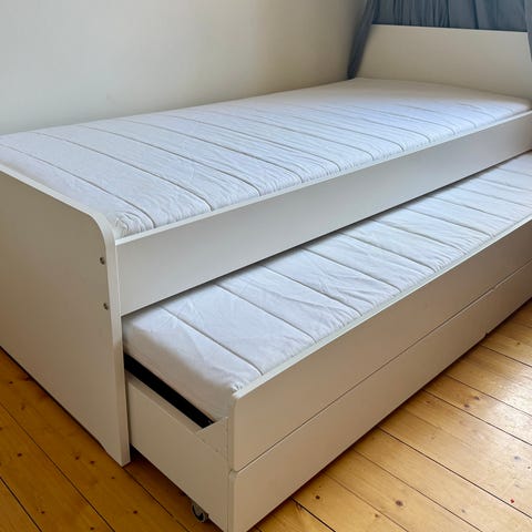 Säng med ribbotten och madrass. Tre lådor och huvud- & fotgavel. Bredd 98-100 cm inkl ram, höjd 55-83,5 cm (säng resp högsta gaveln), längd 210 cm inkl sängram.