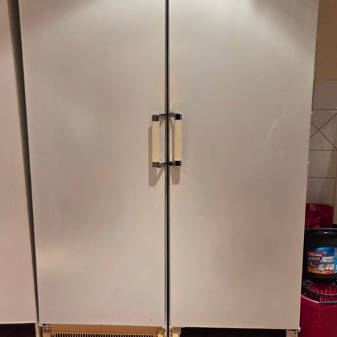 Asko kyl och frys i side-by-side‑utförande. Ytterfinish i vit med integrerade handtag i metall. Ena delen är kyl med flera glashyllor, dörrhyllor och flaskhylla. Andra delen är frys med flera genomskinliga lådor för förvaring. Passar för placering i kök, grovkök eller förråd där man behöver separat kyl- och frysförvaring i fullhöjd.