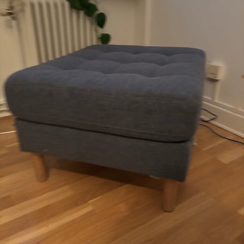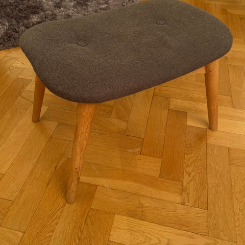 Mio fotpall i grått tyg. Stabil stomme med fyra mörka ben i trä.