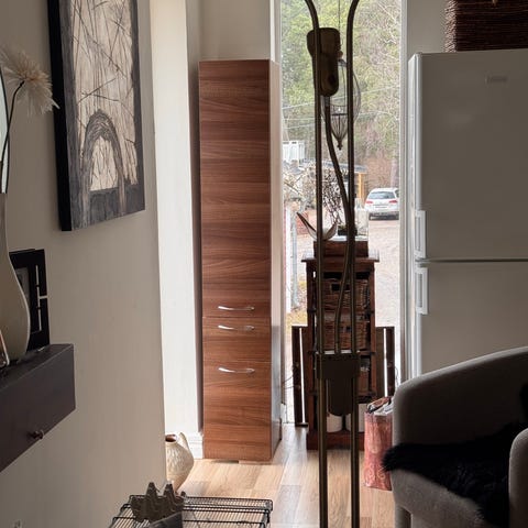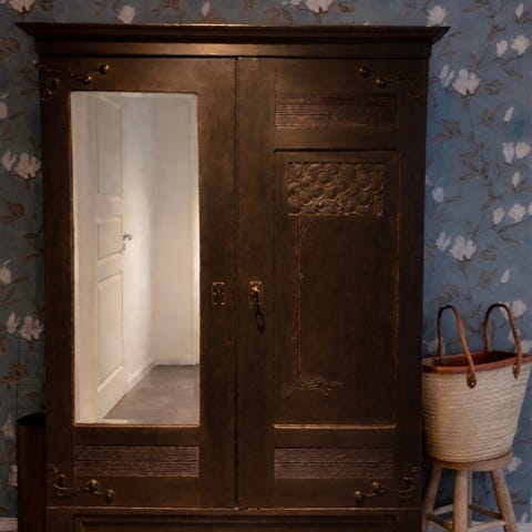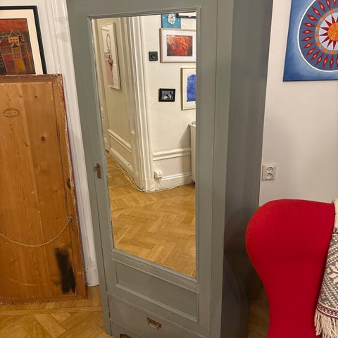 Inne i skåpet har den en mässingstång med hängen. Finns även krokar på väggen för fler möjligheter till ett hänga upp sina ytterplagg.
