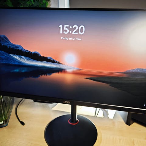 Lenovo bildskärm med 24 tum skärmstorlek i svart. Skärmen har smala ramar och rund fot. Skärmen är sparsamt använd och fungerar som den ska. Några små skrapmärken finns på utsidan (se bild 3), men inget som påverkar bild eller funktion. Perfekt som extra skärm till jobb eller studier.