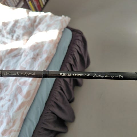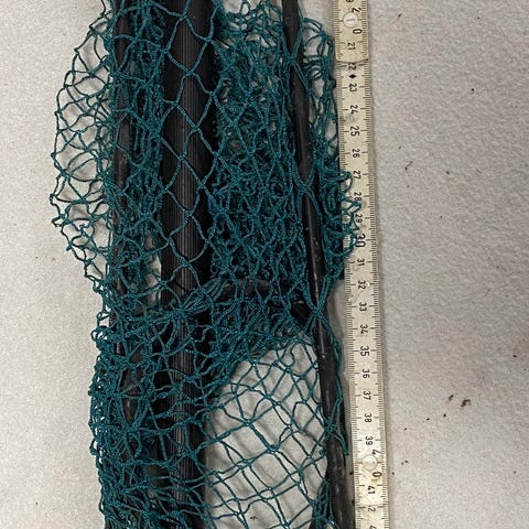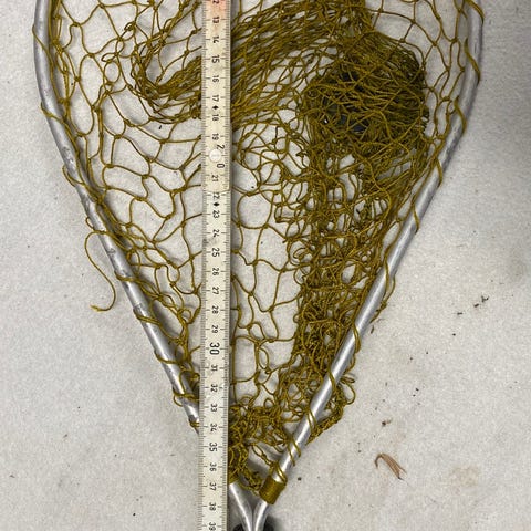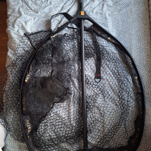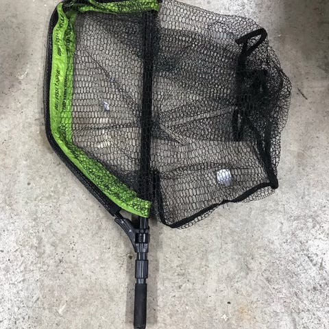 Fiskhåv i svart nät med rektangulär öppning. Kort skaft i mörk färg, lämplig för fiske från båt, brygga eller land. Nätet har relativt stora maskor och är fäst i en stabil ram. Passar för hantering av medelstora till större fiskar beroende på håvens exakta mått.