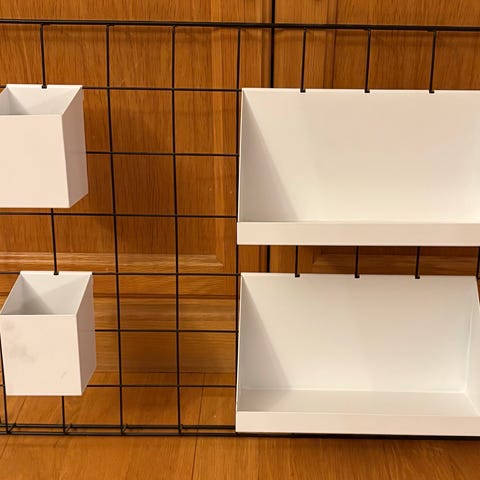 Väggförvaring/skrivbordstillbehör med en trådkorg upptill, elastiskt band runt tavlan, samt en hylla och 6 krokar nertill