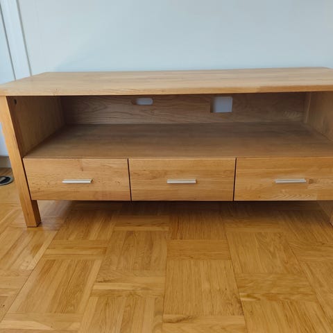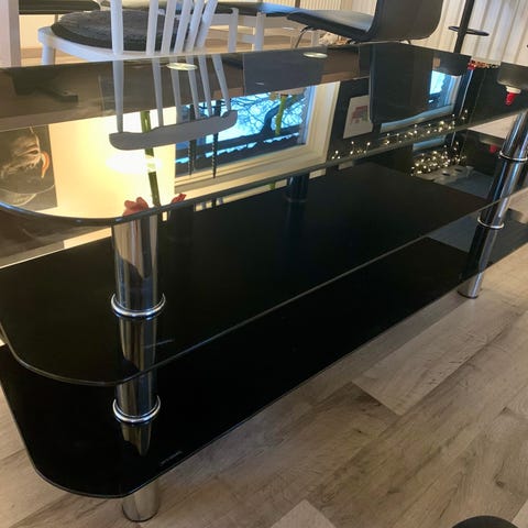 Tv bänk från Norstone. Vit glasskiva och vit glasfront med hydrauliska gångjärn