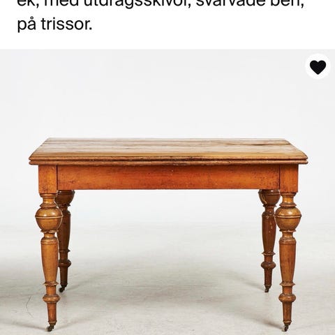 Matbord i trä med brunlaserad yta. Bordet har klaffskiva som kan fällas ut för större bordsyta. Under bordsskivan finns ett förvaringsutrymme som nås genom att lyfta skivan. Benen är svarvade och bordet står på fyra ben. Passar som matbord eller arbetsbord i kök eller vardagsrum.Utfällt. 103 X 96 cm. Ihopfällt. 96 X 51 cm. Höjd. 79,5 cm