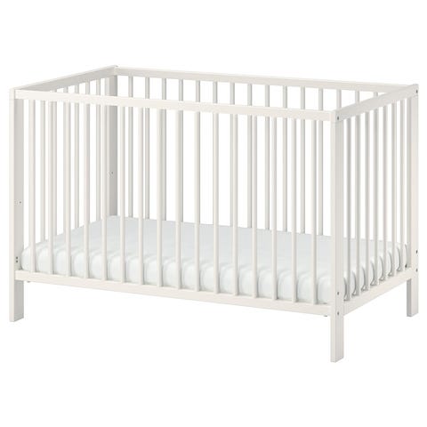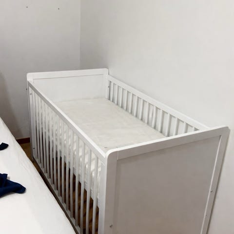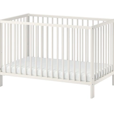 Jollyroom spjälsäng i vit färg. Klassisk modell med ribbor på sidorna och öppning på ena långsidan. Sängen är avsedd för små barn och bebisar. Madrass och madrasskydd syns på bilderna; kontrollera mått och skick vid köp. Passar som sovplats i barnrum eller som extrasäng. Konstruktion i trä eller träbaserat material med lackerad yta.