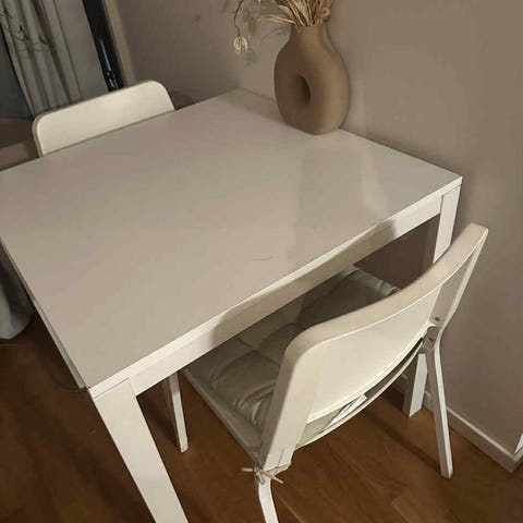 Vitt matbord från IKEA (modell Vihans) tillsammans med två mörkgråa matstolar från Jysk (modell Purhus).
