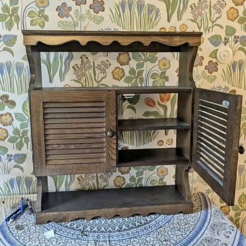 Vägghylla för t.ex. fat/tallrikar. Fin patina. Finns i Enskede och betalas m Swish