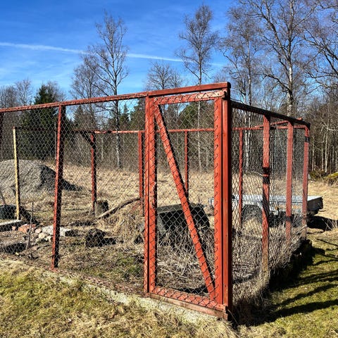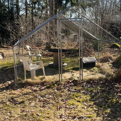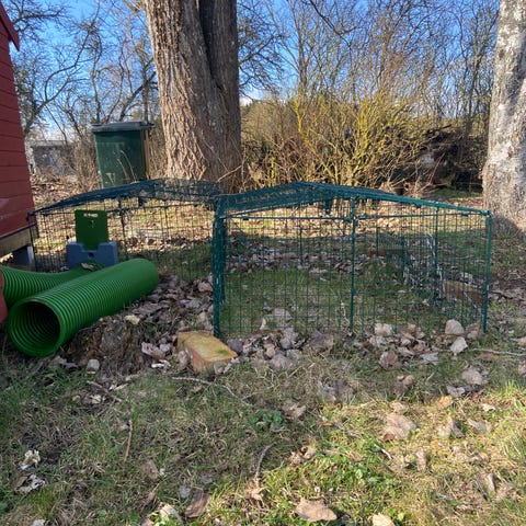 för utomhusbruk med nätväggar i grönlackerad metall och välvt tak i nät/metall. Gården har grind med låsbeslag och förstärkta hörnstolpar. Lämplig som inhägnad för höns, kanin, hund eller andra mindre djur i trädgård eller på tomt. Ny pris ca12000kr.