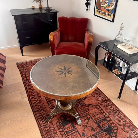Bordet antikt och har lite skavanker och är inte helt stabilt men fungerar fint som sideboard.
