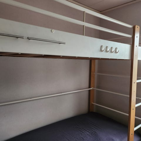 Säljer en praktisk våningssäng med vit ram och grå tygdetaljer. Den grå tygdelen framtill är borttagen.