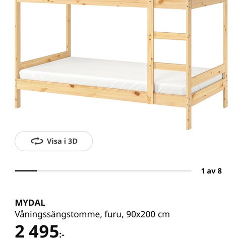 Sängen har ribbottnar för båda sovplatserna samt en stege för att nå den övre bädden. Perfekt lösning för att spara utrymme – passar bra i barnrum eller gästrum.