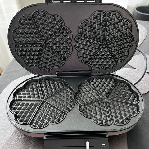 Emerio våffeljärn dubbel i svart utförande. Järnet gräddar två hjärtformade våfflor åt gången och har justerbar temperatur med vred från min till max. Utrustad med indikatorlampor för ström och när våfflorna är klara. Invändiga plattor med mönster för frasiga våfflor. Avsett för användning i kök för gräddning av tunna våfflor.