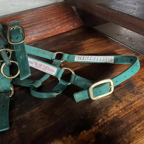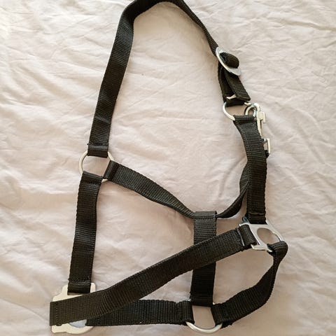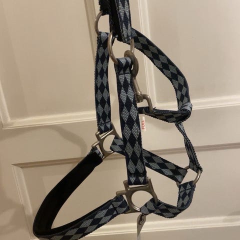 Ljusblå med grå aktiga spännen, stl full, egentligen ny men har nån fläck, kan skickas mot frakt