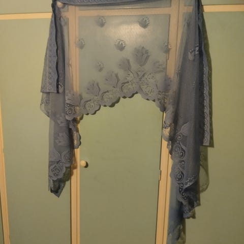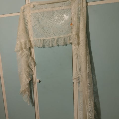 Vit spetsgardin med dekorativt mönster. Tunn, genomskinlig textil som passar exempelvis till fönster eller som draperi där man vill släppa in ljus men ändå få viss avskärmning. Gardinen har ett genomgående mönster och en markerad kant nedtill.