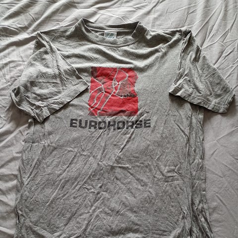 Mörk blå med vit text/ tryck, stl L, liten i storleken, v- ringad, begagnad, tvättad, priset är + frakt