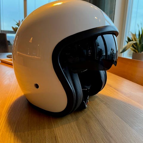 Nolan N20 öppet mc-hjälm i storlek XS. Hjälmen är vit med klart visir som kan fällas upp. Invändigt har den vadderad och ventilerad inredning samt justerbart hakband med snabbspänne. Passar för motorcykel eller mopedkörning 550:-