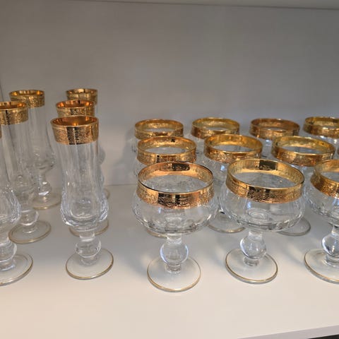 Snapsglas i klart glas med dekorativ guldfärgad kant och tryck med årtal 1980 - 1996.Glasen är små och lämpar sig för servering av snaps eller andra avecdrycker vid dukning och festliga tillfällen. Rymmer ca 1 cl . 17 st.