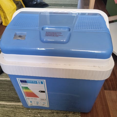 Kylbox i grå färg med rektangulär form. Lådan har lock med två runda detaljer upptill och integrerade bärhandtag på sidorna för enklare transport. Passar för förvaring och kylning av mat och dryck vid exempelvis utflykter, camping eller resor. Materialet verkar vara hårdplast med förstärkta kanter för bättre stabilitet.