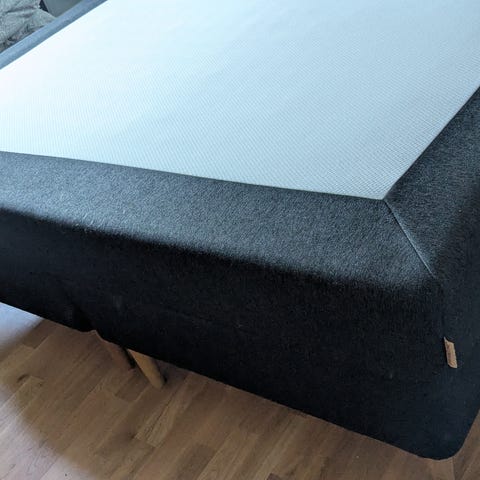 IKEA 160 kontinentalsäng i grått tyg. Sängen består av två nedre resårbottnar med gemensam madrass ovanpå, vilket ger en stabil liggyta. Ben i trä. Passar som dubbelsäng i sovrum eller gästrum.