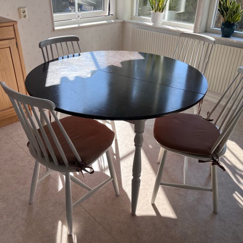 Matgrupp runt bord med iläggsskivor och fyra stolar vit trä